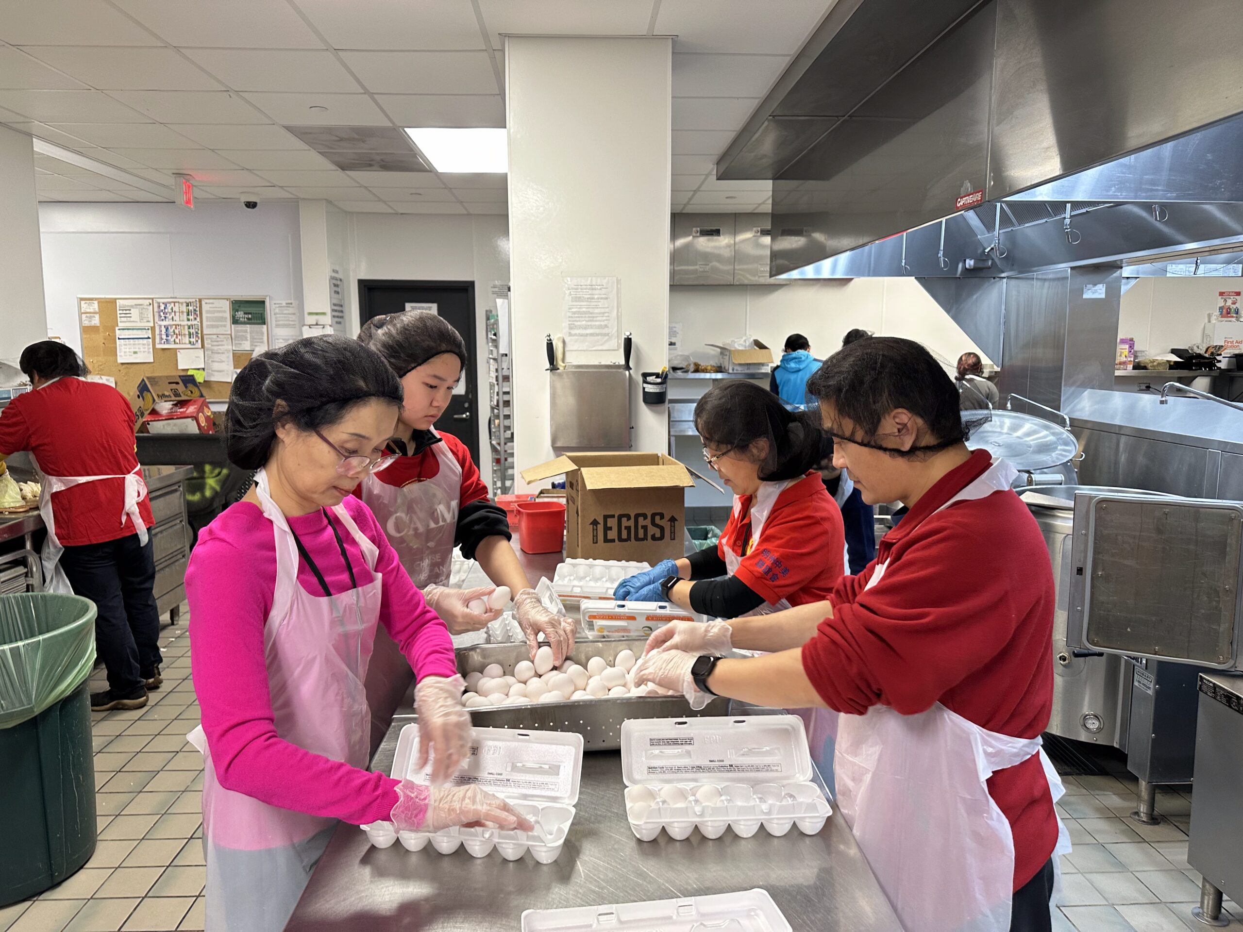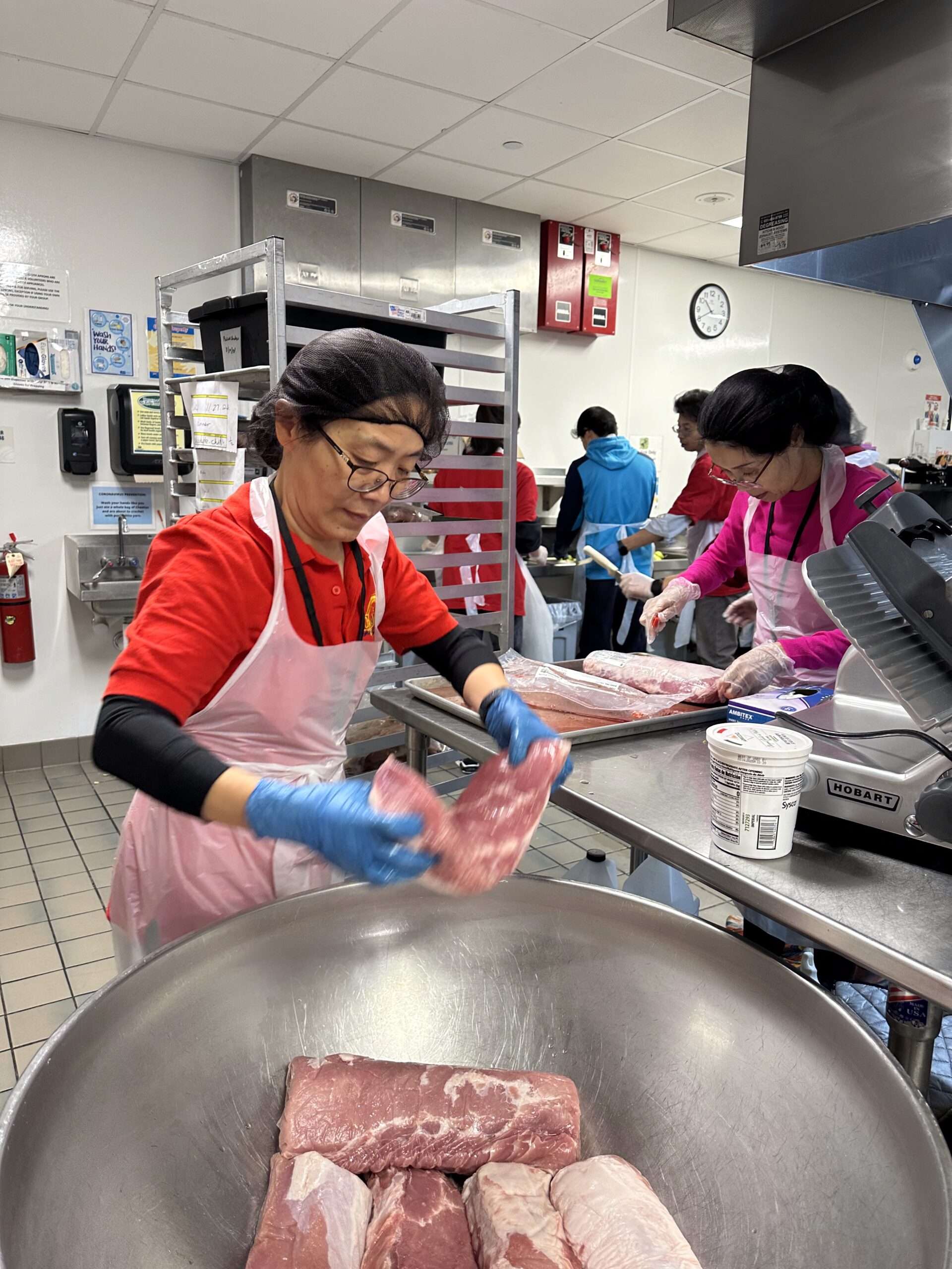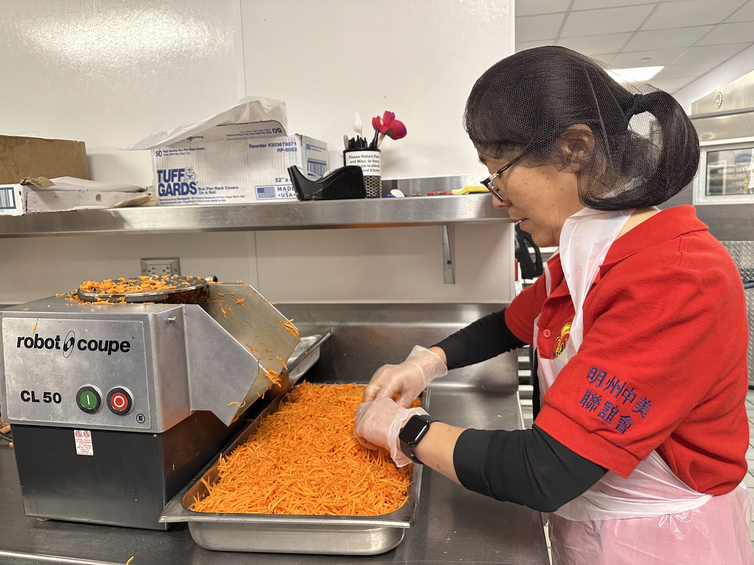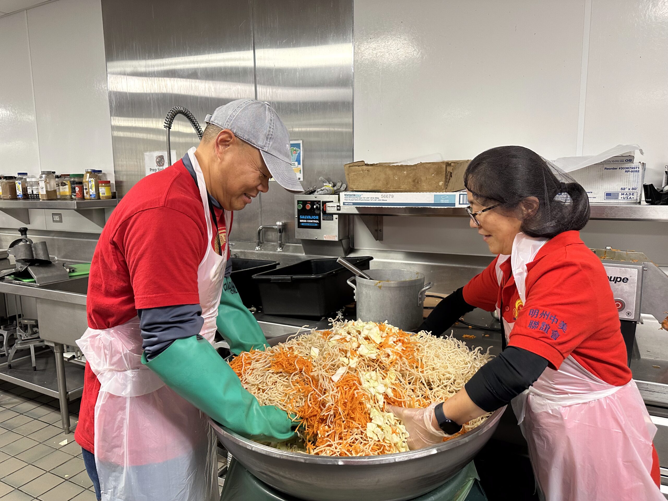 As was the case last year, winter arrived relatively late this year. Although it was slightly chilly in St. Paul on Sunday, the sun shone warmly. Around 9:30 AM, CAAM board members and volunteers started arriving at the kitchen of the activity center to begin preparations. In less than an hour, they had prepared a vegetable salad with cabbage and carrots for hundreds of people. Additionally, they prepared apples, bananas, and strawberries for the meal. The volunteers also assisted the kitchen staff in preparing a large number of boiled eggs and roasted pork loin for dinner. Around 10:45 AM, Mr. and Mrs. Zhou, the owners of the Rose Garden Asian Bistro, personally delivered the ordered Chinese meals to the activity center. Everyone then busied themselves with placing the meals in thermal cabinets and preparing meals for the less mobile homeless individuals in the dormitories.