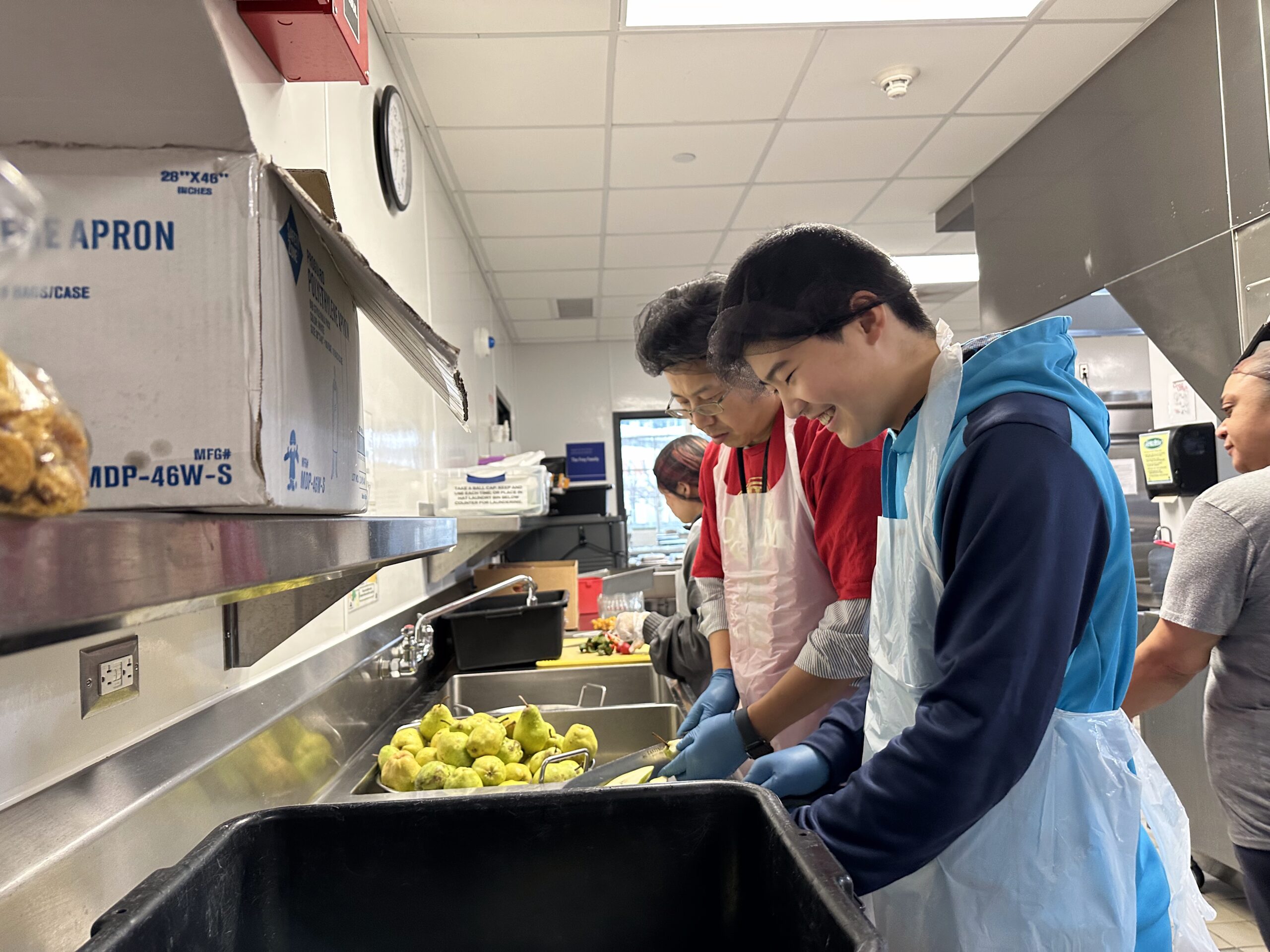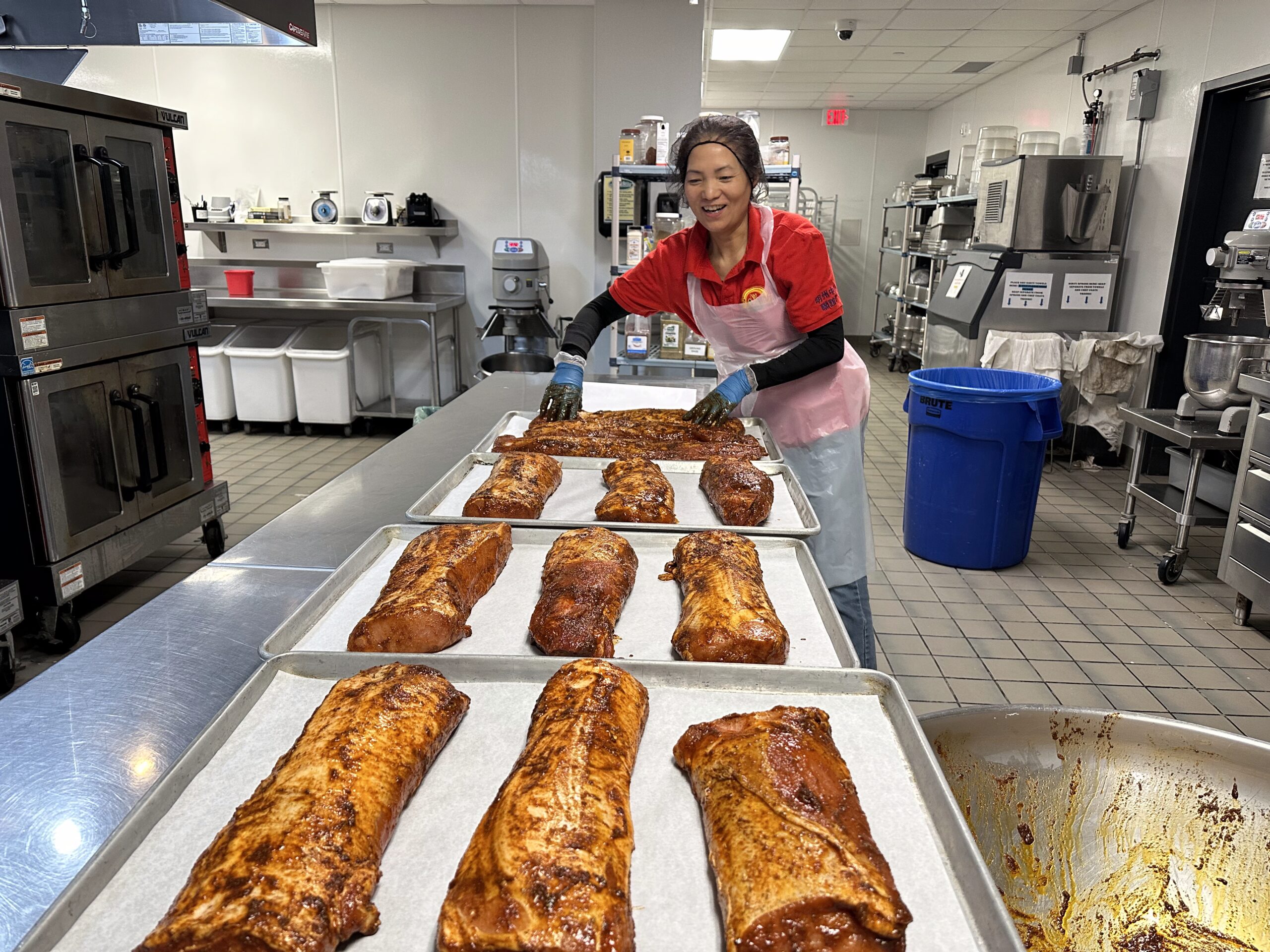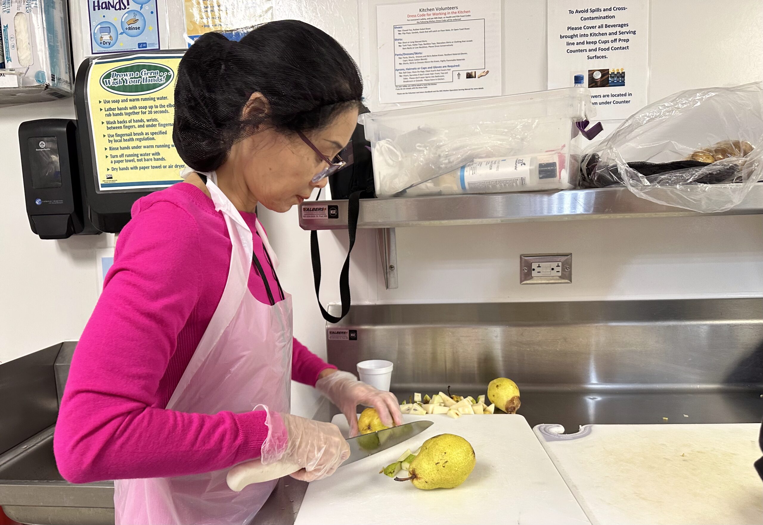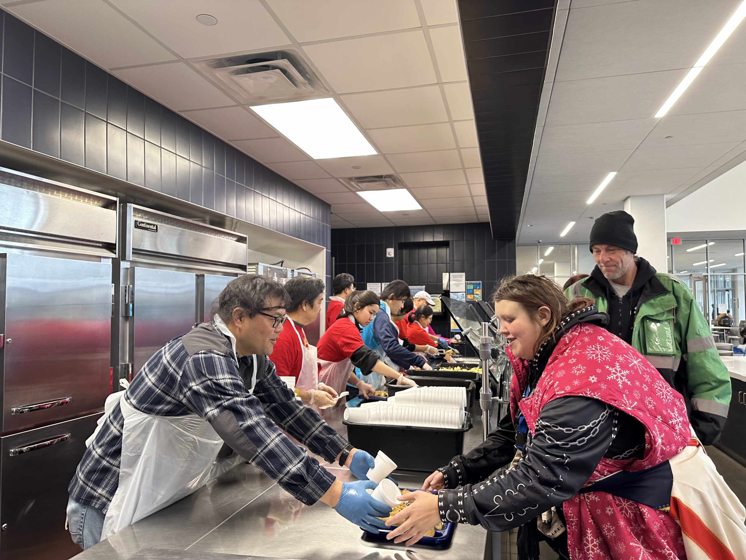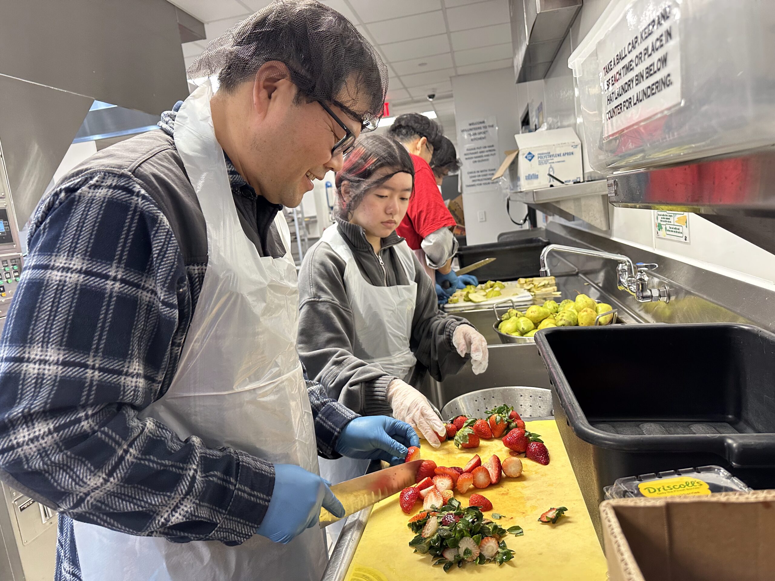 As was the case last year, winter arrived relatively late this year. Although it was slightly chilly in St. Paul on Sunday, the sun shone warmly. Around 9:30 AM, CAAM board members and volunteers started arriving at the kitchen of the activity center to begin preparations. In less than an hour, they had prepared a vegetable salad with cabbage and carrots for hundreds of people. Additionally, they prepared apples, bananas, and strawberries for the meal. The volunteers also assisted the kitchen staff in preparing a large number of boiled eggs and roasted pork loin for dinner. Around 10:45 AM, Mr. and Mrs. Zhou, the owners of the Rose Garden Asian Bistro, personally delivered the ordered Chinese meals to the activity center. Everyone then busied themselves with placing the meals in thermal cabinets and preparing meals for the less mobile homeless individuals in the dormitories.